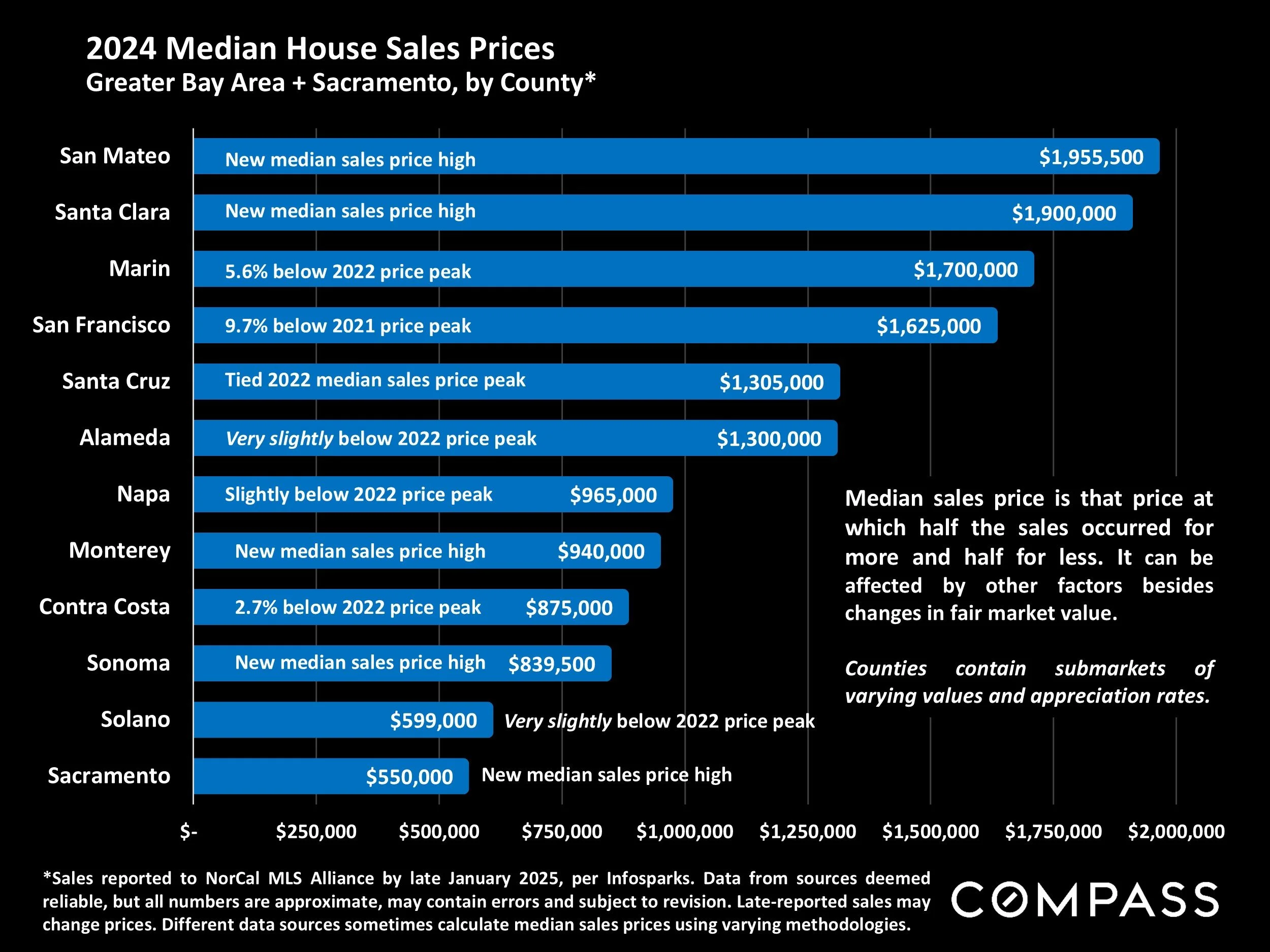 Looking at median house values in 2024, San Mateo and Santa Clara counties hit new highs and sit atop the chart. San Francisco; usually the top dog in pre-COVID years, is down to number four and comes in at just over $1.6M.