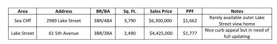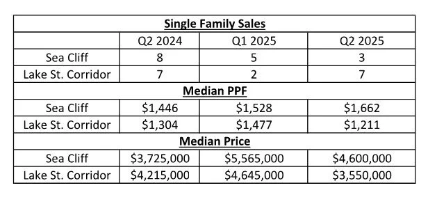 In the Lake Street Corridor, inventory crept up from the beginning of the year, but the sales were fairly flat when looking at historical quarter data. As in Sea Cliff, the sold properties in the area sold with a median of 13 days on the market and closing at 107% of list price.