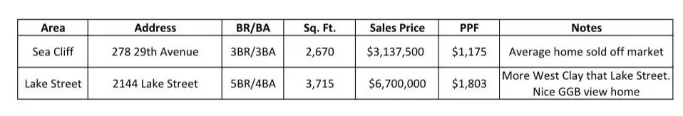 Top sales? One option in Sea Cliff and it’s not truly reflective of the neighborhood (278 29th Ave.). The top sale on Lake Street was prior mentioned 2144 Lake Street. Nice home but no interior access from the garage, the lower level at the front of the home felt disconnected. Regardless, someone loved it…a lot!