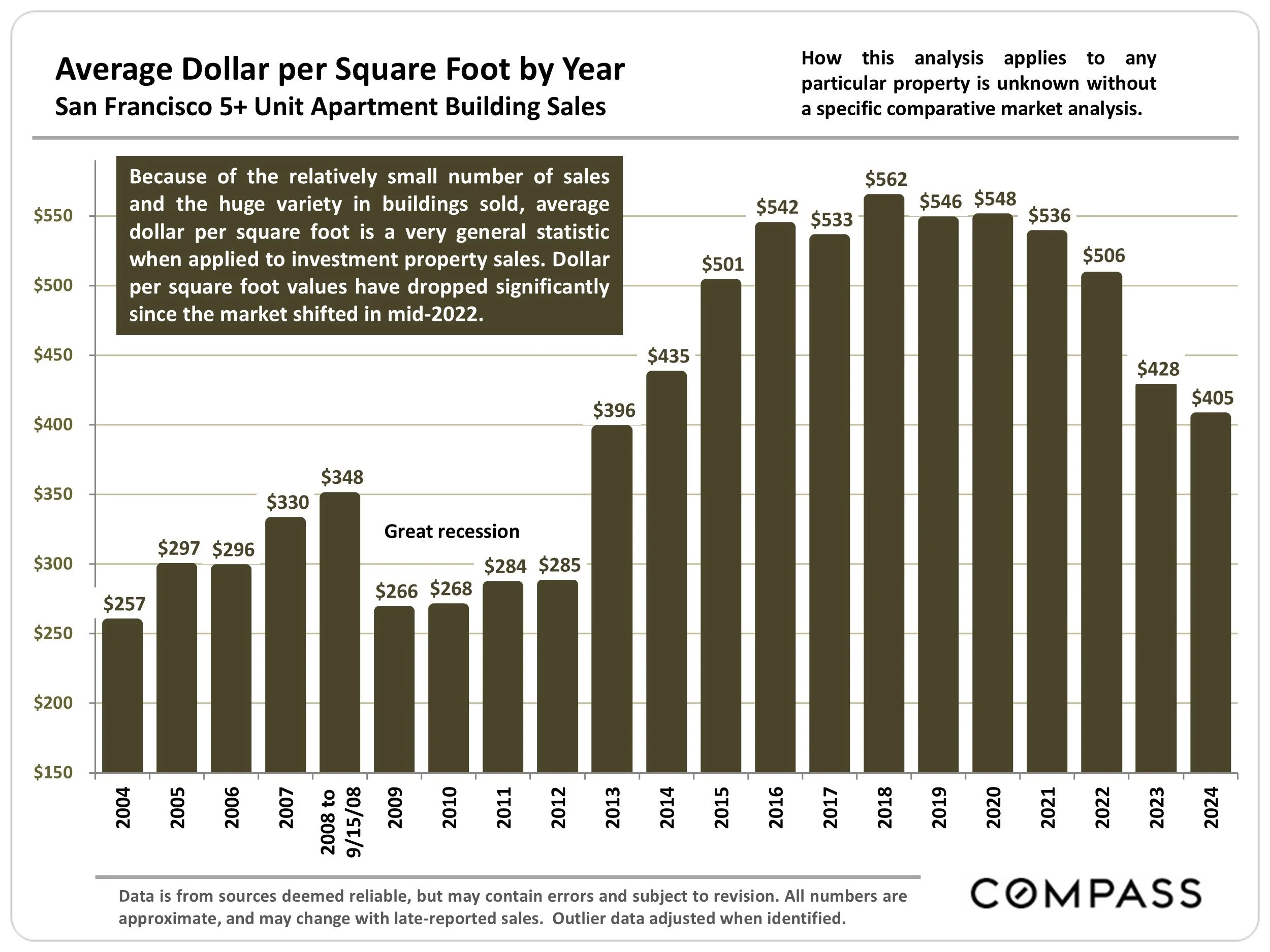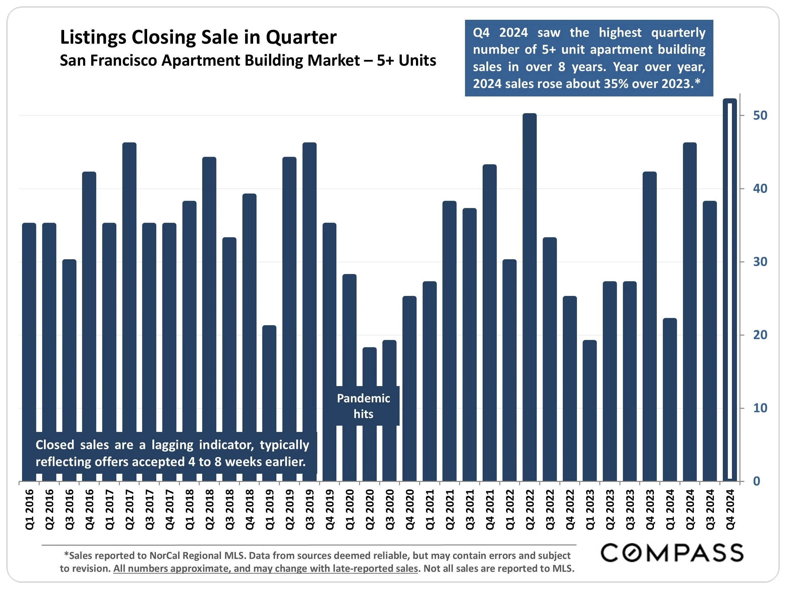 San Francisco apartment sales volume increased by about 35% (vs. 2023) and there was a 69% rise in closed transactions for properties of 10+ units. In the fourth quarter alone, we saw the highest number of sales (in a quarter) since 2008!